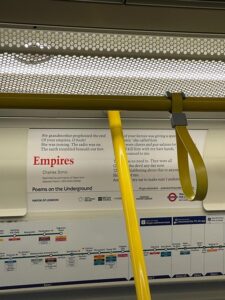 صورة لقصيدة “امبراطوريات” المنشورة في قطار مترو الأنفاق في لندن. تصوير المترجمة في ٢٧/١٢/ ٢٠٢٣م.